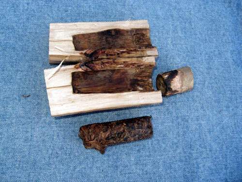 en un leño verde de arce, álamo, abedul u olmo que luego se prensaba con un palo y un martillo y
