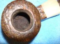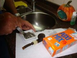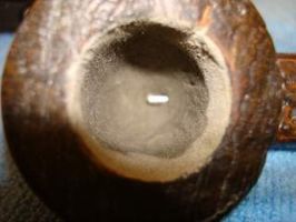 lijada, se limpio con Cif (pule metales sin rallar) y se la repasó con Autopolish. El trabajo aun no está terminado, cuando se seque bien, una lija del número 600 servirá para alisar a fondo el horno, y la pipa y su boquilla deberán pasar por carnauba y Autopolish. El interior del horno quedara casi blanco cemento, se lo puede dejar así y tratar con miel y tabaco o con pintura negra de grafito, en ambos casos la reparación no se notará de forma alguna. |