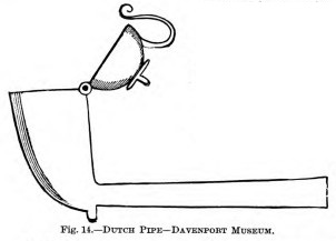 Las placas de bronce AAA (figs. 12-13) están unidas con costuras de plata. Pipa con costuras de plata. La pipa número 14 se encuentra ahora en la colección de la Academia de Ciencias Naturales de Davenport (Iowa). El Sr. W. H. Pratt, que ha tenido la amabilidad de proporcionarme un boceto, la describe como una pipa de chapa de hierro que le regaló un alumno hace varios años, que pertenecía a una familia holandesa residente en el barrio. La ilustración es del tamaño real, y no puede haber duda de que el original es una de las primeras producciones holandesas que ha llegado a los Estados Unidos, y que tiene un sorprendente parecido con algunas de las formas antiguas mostradas en la figuras.