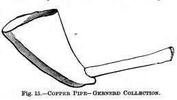 Una pipa de cobre o bronce (fig. 15), encontrada en un campo en el condado de Montour, Pa., es propiedad del Sr. J. M. M. Gernerd, de Muncy, Pensilvania. No se sabe con certeza si se trata de una producción puramente aborigen, o si fue traída de Europa y comerciada con los nativos hace un siglo más o menos. La forma es inusual, aunque se han sacado a la luz especímenes algo similares en el continente oriental.