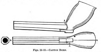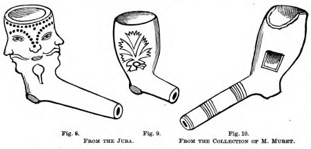 Las figuras 8-9 representan dos pipas de hierro del Jura (Cantón de Berna), de A. Quiguerez. El original de la fig. 10 se encuentra en la colección de M. Muret, Conservateur aux Médailles, París. El material es el bronce, y en uno de los lados de la cazoleta se puede ver una pequeña abertura cuadrangular. La Fig. 11 se supone que es una pipa etrusca, con una hermosa pátina, de la colección Campana. Las figuras 12-13 son dos vistas de una pipa de bronce encontrada en el año 1858 en un bosque cerca de Biel, Cantón de Berna.