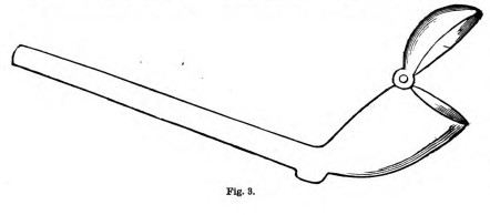 Los anticuarios difieren en cuanto a su antigüedad. Algunos sostienen que son de fabricación romana, basándose en la circunstancia de que a veces se han encontrado en las ruinas de las moradas romanas. Otros, a los que yo pertenezco, las consideran producciones del siglo XVI o XVII, y reconocen en ellas las primeras pipas que se utilizaron tras la introducción del tabaco en Europa. Las tres pipas de nuestra colección han sido encontradas en el Cantón de Zúrich, y están hechas de gruesas placas de hierro, rizadas y soldadas con cobre... El número 3 de las pipas de Zúrich, como el número 7 de las pipas de Quiguerez, tiene una tapa arqueada con dos perforaciones. Ver fig. 4. Aunque, como veis, estas pipas se encuentran con frecuencia entre nosotros, no tienen, como en Inglaterra, nombres peculiares entre la gente común. Soy de la opinión de que son las mismas que se hacían en los siglos XVI o XVII, y que a veces aparecen accidentalmente con las reliquias romanas.