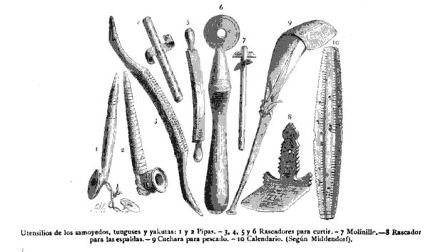 El tabaco se fuma en pequeñas pipas de hierro o de marfil con punta de madera que son imitaciones de Ias chino japonesas (véase la siguiente imagen): pocas chupadas bastan para consumir el contenido de las mismas, pero los fumadores hacen las aspiraciones tan profundas que a menudo producen un efecto embriagador. Para aumentar la fortaleza del tabaco se le coloca sobre una capa de pelos de rengífero; estos y las virutas de madera, sobre todo si han sido cortadas de una vieja punta de pipa, constituyen un agradable sustituto del tabaco.