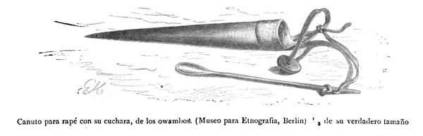 Los betschuanos, como todos los demás sud-africanos, son aficionados en extremo al tabaco, que llaman "mala hierba divina" y que sólo usan en forma de rapé, por cuya razón las tabaqueras de calabaza, o de cuerno, o de hueso, son artículos indispensables de tocador (véase la figura siguiente).