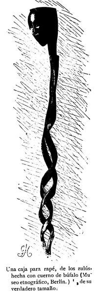Con plátanos y caña de azúcar se preparan otras bebidas espirituosas, y es también costumbre generalmente extendida por toda la zona palmífera la de encentar las distintas clases de palmera para sacar el vino que contienen. A estos placeres hay que agregar los del tabaco, del cáñamo, de las habas del café y de las nueces del gurú. Estos pueblos tienen verdadera pasión por el tabaco, que toman en todas las formas de que este es susceptible. En el Africa oriental, los paganos prefieren fumar y las tribus mahometanas mascarlo: entre los cafres, es más común el tomar rapé, cosa que hacen a la perfección. Su manera de aprovechar el rapé es ingeniosísima: entre dos piedras frotan el tabaco de fumar hasta convertirlo en polvo y entonces Ie echan ceniza y brotes frescos de una hierba fuerte para darle mayor fortaleza y para que resulte mayor cantidad. Este rapé "preparado" lo echa el cafre en un pedazo de piel de la cual toma grandes raciones de este polvo narcótico y picante que introduce en su nariz. Sumido en este placer, puede permanecer durante largas horas sentado al sol con la preciosa piel aplicada constantemente a la nariz hasta haber consumido el último granito. Los muy ricos pueden permitirse el lujo de tomar el rapé de una caja que llevan colgada del lóbulo auricular en forma de caña, o anudada al cuello o al cinturón en forma de canuto de calabaza o de marfil. Del ajuar del fumador forma también parte la cuchara de la nariz (libeko) pequeña pala de 4 a 35 centímetros que sirve, además, para rascar las manos después de la comida, como sabemos lo hace Sepopo, rey de los marutses. Para fumar tienen esos pueblos distintos utensilios: los del Africa del Sud el cuerno de antílope, cuya parte ancha sirve de receptáculo; los de los territorios ecuatoriales la pipa que puede contener hasta medio kilogramo de tabaco; y los pueblos primitivos el agujero practicado en el suelo y cubierto con piedras horadadas. La costumbre de mascar el tabaco esta poco extendida y parece haber sido introducida por los árabes. La aspiración de la nicotina que queda depositada en el fondo de la pipa es por muchos considerado como el máximo de este placer. El valor que los negros dan al tabaco se demuestra por el importante papel que en sus costumbres desempeña: su ofrecimiento y consiguiente aceptación constituye un modo de saludarse que establece estrechos lazos entre dos personas.