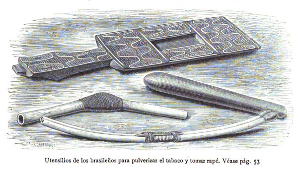 un poco de tabaco arrollado en hojas de otras plantas. Es un hecho característico el de que algunas tribus, como por ejemplo la de los churrujes de Colombia, a pesar de su pasión por fumar tabaco y a pesar de gozar de un clima tan a propósito, no cultivan esta planta. Para tomar rapé tienen los sudamericanos una porción de aparatos: las tribus de Guayana usan una caja que consiste en un gran caracol glotón cuya base está cerrada por un ala de murciélago fijada por medio de balata o gutapercha: su contenido consiste en un polvo aromático de composición desconocida que se saca de la caja sacudiendo el molusco cuya punta encaja en un hueso hueco que es el que contiene el rapé. Para llevar el polvo a la nariz tienen los indios un aparato compuesto de dos huesos de pájaro huecos y pegados con balata (véase el grabado siguiente: colocado un extremo en la boca y el otro en un agujero de la nariz, basta soplar para que el polvo llegue hasta lo último de la membrana pituitaria. Este aparato no lo usan más que los egoístas, pues la gente sociable emplea un instrumento que consiste en dos huesos cruzados en forma de X por medio del cual los amigos se soplan el rapé mutuamente.