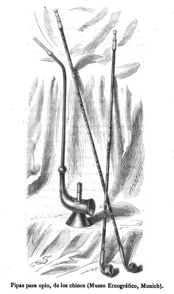 La costumbre de fumar opio se ha extendido tanto m ás en la Mogolia cuanto que muchos chinos emigraron allí para sustraerse a la prohibición de cultivar la adormidera y de preparar el opio que en su Imperio existe y ha alcanzado su apogeo en los centros de las más apartadas de esas posesiones del Este del Turkestán. Los mogoles fuman el tabaco en pequeñas pipas chinas; sus hermanos los kalmukos del Volga usan una pipa más europea con tapadera para que el fuego resista los terribles huracanes de la estepa.