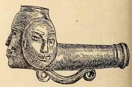 El Sr. Andrew E. Douglass tiene en su colección esta pipa, retrato muy interesante y altamente ornamentada, que se dice que fue encontrada en las profundidades de una mina en San Salvador, América Central, y que es de un carácter único en la experiencia del escritor, ya que está hecha de una pizarra azul oscuro o gris, similar a la que se trabaja en la Isla Reina Carlota, en el Pacífico. En la cazoleta hay tres caras humanas, ninguna de las cuales mira al fumador, las de los lados se parecen mucho a las máscaras. La pipa mide 4,5 pulgadas de largo, con una altura de 2 pulgadas. En la parte inferior del caño hay un mango en forma de pergamino, tallado en la piedra, ligeramente curvado y enrollado en cada extremo, donde está unido al caño, mientras que alrededor del extremo del caño hay una banda como la que se encuentra a menudo en la costa atlántica del sur de los Estados Unidos, pero desconocida en el Pacífico según la experiencia del escritor. Esta asa en forma de voluta está tallada por alguien familiarizado con el metal pesado y se dice que se encontró a 14 pies de la superficie de una mina trabajada en la época de la conquista. La cara de esta pipa, en el extremo de la cazoleta, tiene un bigote. La pipa ha sido perforada con una herramienta de acero puntiaguda.