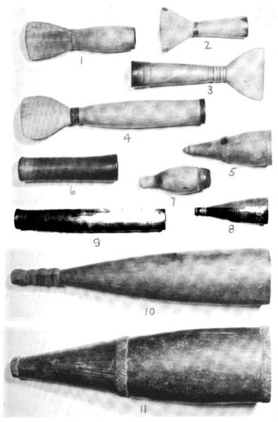 Pipas de tabaco de madera con tallos de hueso posterior. Conebo, río Ucayall, este del Perú. (Según Farabee, 1922, fig. 7.) |