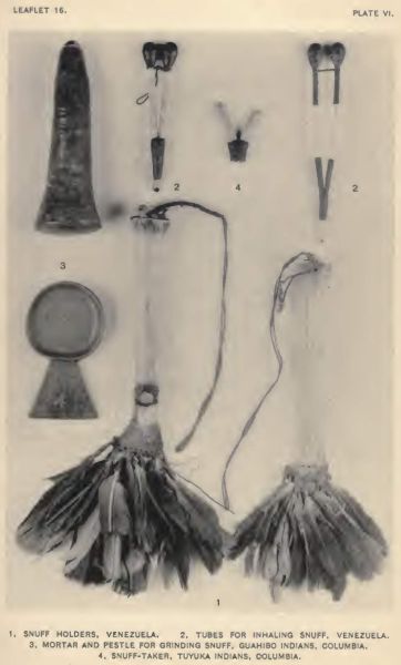 1. Porta rapé, Venezuela. 2. Tubos para esnifar rapé, Venezuela. 3. Mortero y maza para moler rapé, Guahibo, Colombia. 4. Tubo para esnifar, indios Tuyuka, Colombia. |