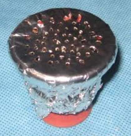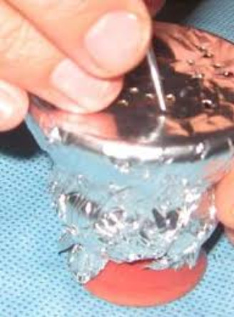 Con el punzón hice pequeños orificios sobre el papel de aluminio que cubría la cazoleta.