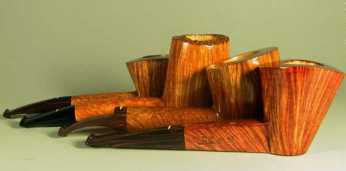 Las boquillas son de lucite y hechas a mano; utiliza a veces el ámbar cultivado. Solamente unas pocas pipas