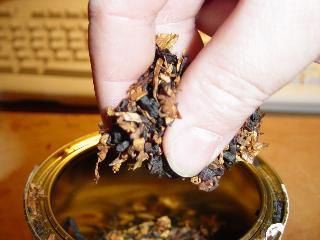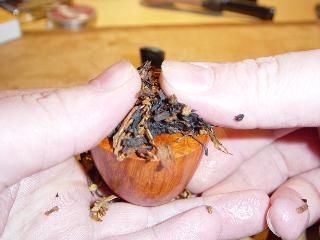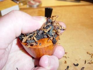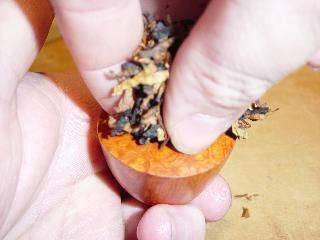 que dé por lo menos para llenar la cazoleta. Si esta cantidad de tabaco parece demasiado grande para caber en la cazoleta, probablemente has tomado lo correcto. Mejor que sobre a que falte, el exceso puede ser recortado después. Recordar, no usamos la técnica de colocar capas en este método así que asegúrate de tener suficientemente tabaco para llenar la cazoleta fácilmente. |